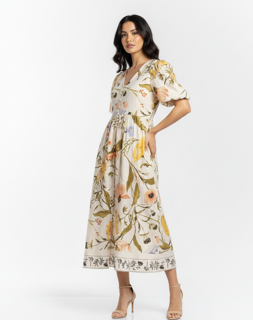 A sensational bold botanical border dress, our Chelsea is just the right piece for occasions, vacations and just for those days we need a little something upbeat and outstanding.