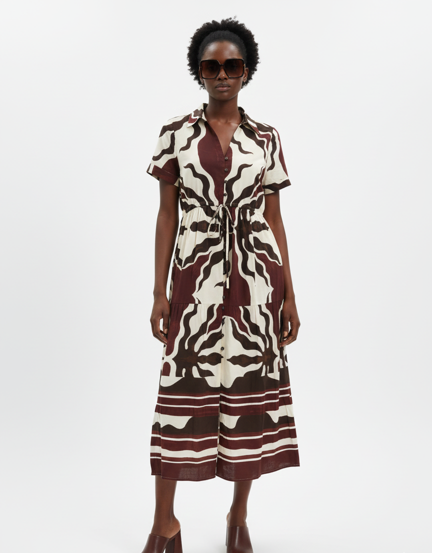 A staple design, we couldn't resist adding blown up abstract brown tones to our classic Gabriella midi dress.