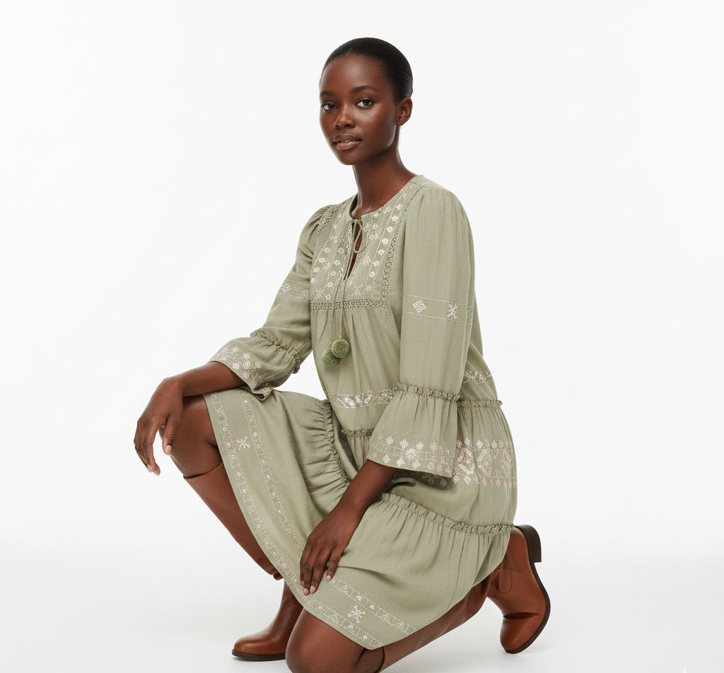 Confident yet soft is what Taylor is about. Embroidered with pom pom details and lace trims made from 100% Cotton. The metallic embroidery nods to the sunlight within us in a grounded green base tone to make it perfect for day wear.